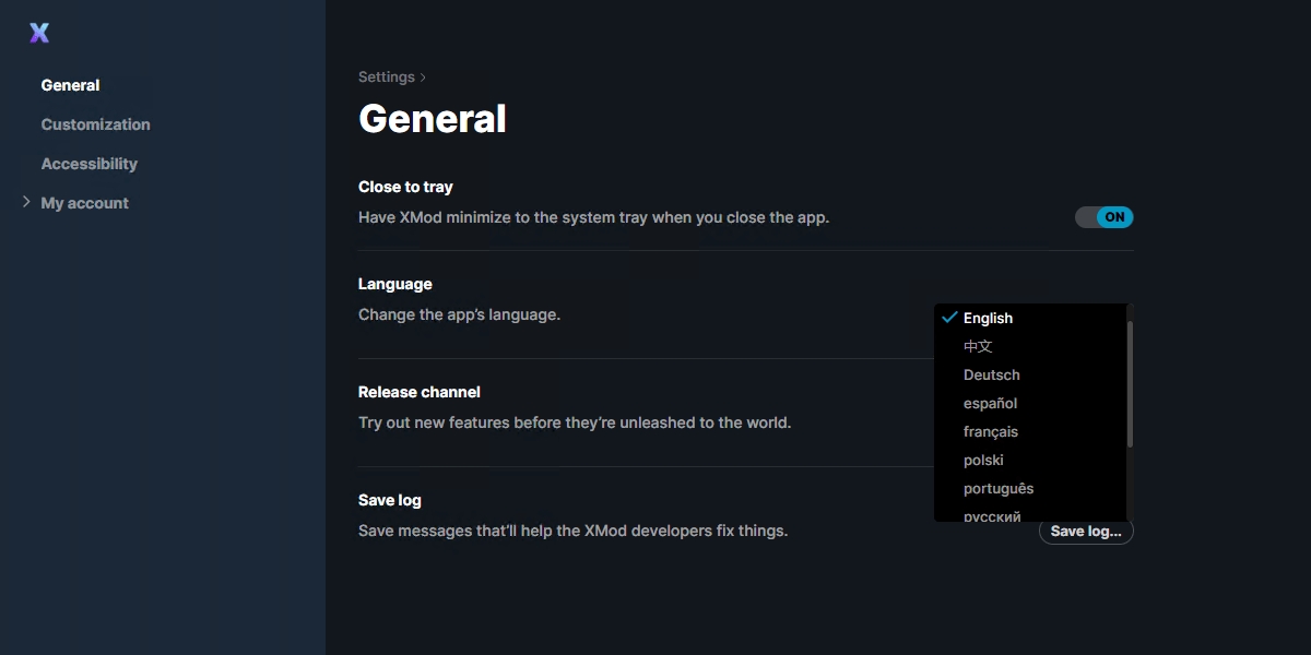 XMod está actualmente disponible en Inglés, Chino, Ruso, Alemán, Francés, Español, Portugués, Turco, Polaco, Japanés, Coreano y por diversión, leetspeak.