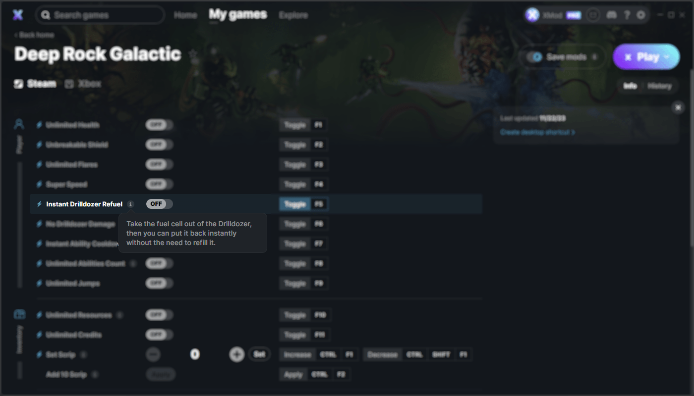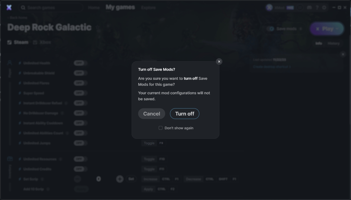 Nuestra función Pro de Mods guardados hace exactamente lo que dice su nombre: recuerda los ajustes de tus mods entre sesiones de juego. Cuando tengas tus mods configurados de la manera que quieres y Mods guardados esté activado, podrás reanudar el juego justo donde lo dejaste cada vez que quieras y con los ajustes que prefieres.